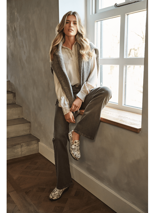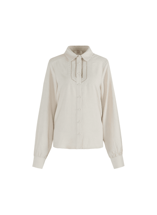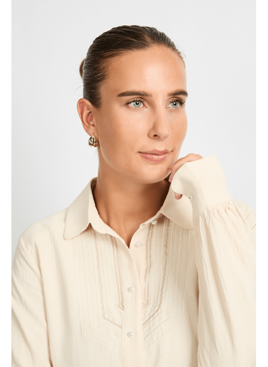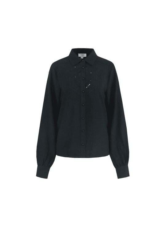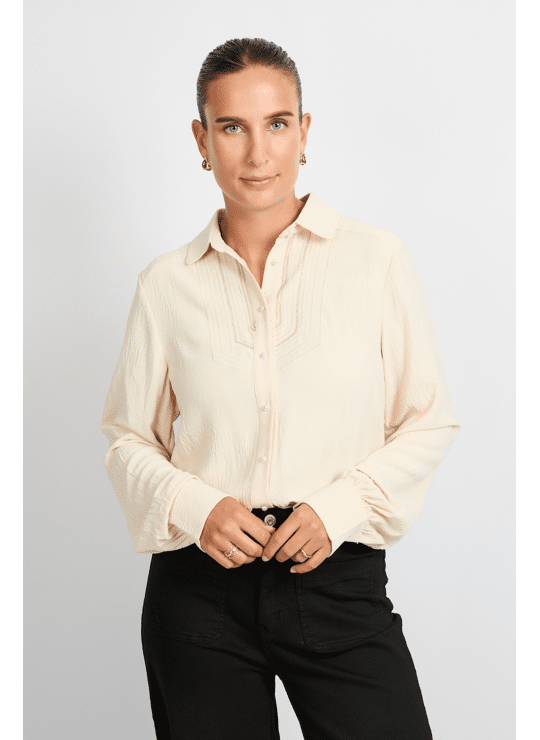 | De Linda blouse is een elegante blouse met subtiele western-invloeden. Het losvallende model is uitgevoerd met een klassieke kraag, doorknoopsluiting en decoratieve stiksels op de borst die de blouse een speels accent geven. De licht gepofte mouwen met manchetten zorgen voor extra volume. Mooi te combineren met een denim voor een casual look of met een pantalon voor een meer geklede sti |