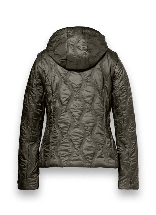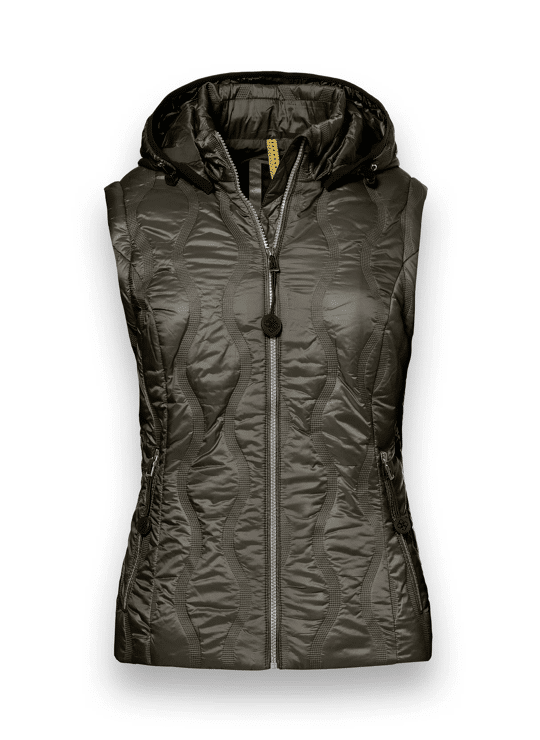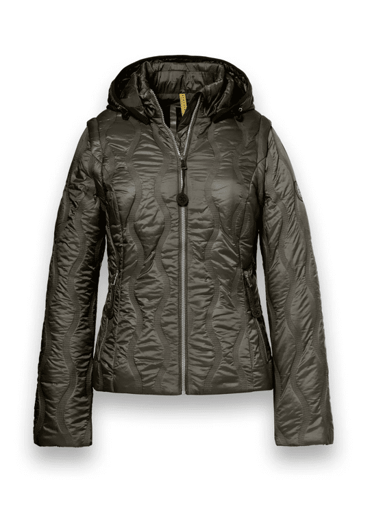 Imitatie donsjackje, met afritsbare mouwen om te zetten tot bodywarmer. Met laserprint in fantasievorm. Afneembare, verstelbare capuchon met koordjes en contrasttape. Metallook ritsen in front en zakken. Logobadge op mouw Logoprint in binnen voering. Met afsluitbare binnenzak.