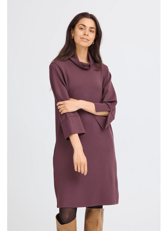 Deze coljurk biedt een losse pasvorm, driekwartsmouwen en knielengte, waardoor comfort en stijl voor diverse gelegenheden samenkomen.