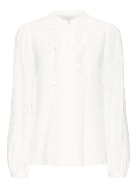 Blouse met losse pasvorm, subtiel getextureerd, lange licht gepofte mouwen, opstaande kraag en fijne ruches langs de knoopsluiting.