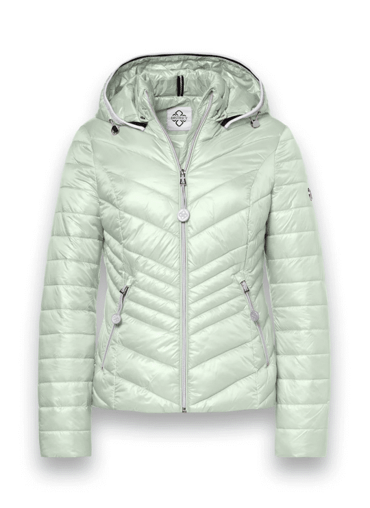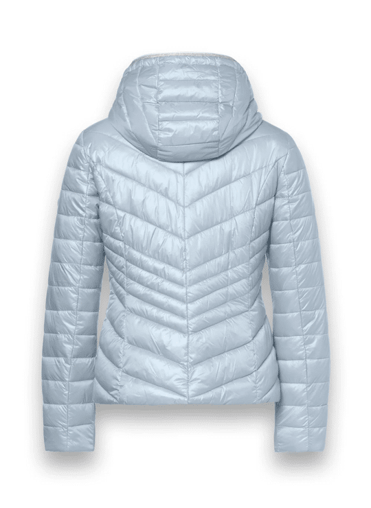 Imitatiedonsjackje, met zilverkleurige ritsen met logopuller in zakken en voorsluiting. Capuchon afgezet met fantasietape. Logoprint in voering en afsluitbare binnenzak.