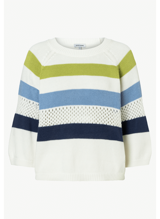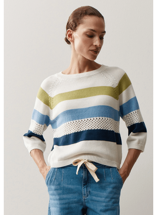 Deze lichtgewicht gebreide trui van MORE & MORE geeft je garderobe een vleugje zomerse frisheid. De harmonieuze strepen in wit, groen, lichtblauw en marineblauw zorgen voor een moderne, casual look. Subtiele opengewerkte details voegen stijlvolle accenten toe en maken het ontwerp bijzonder. De relaxte pasvorm met verlaagde schouders en driekwartmouwen zorgt voor een comfortabel gevoel – perfect voor makkelijke alledaagse outfits. Combineer hem eenvoudig met een jeans of pantalon voor je nieuwe favoriete look.
