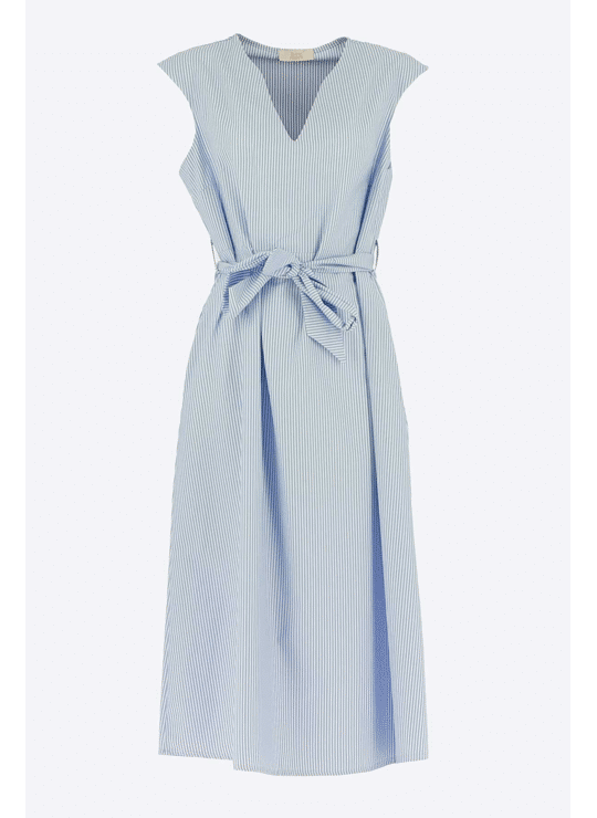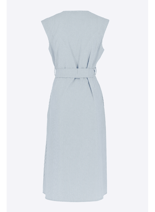 Lange mouwloze gestreepte jurk met ronde hals en V met onzichtbare ritssluiting aan de zijkant en uitlopende onderkant, uitsnijding in de taille, steekzakken in de naad en tailleband
