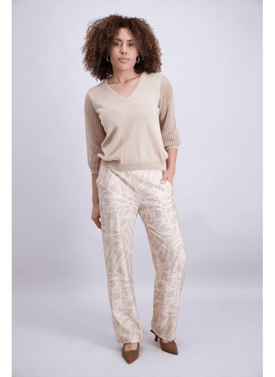 Effen gebreide trui met V-hals, 7/8 mouwen en fantasiepatroon