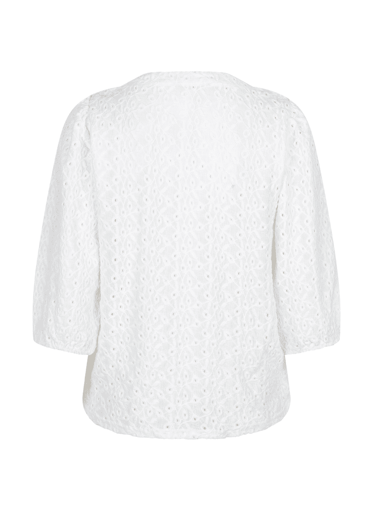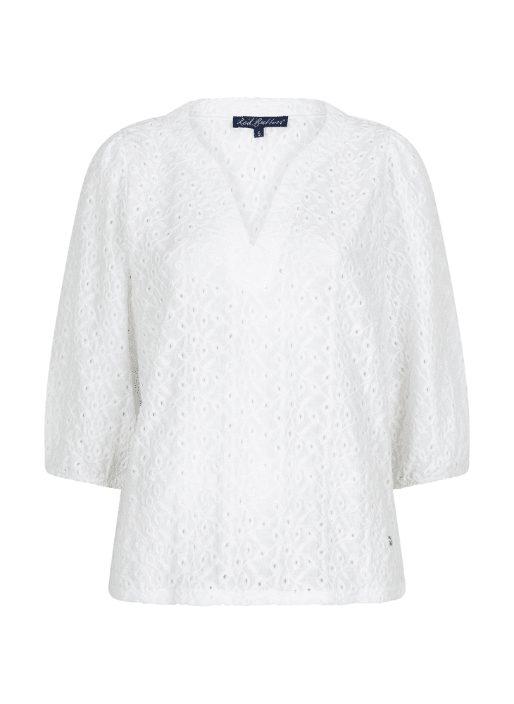 De Top Ajour is gemaakt van broderie en heeft een V-hals. De top heeft driekwart ballon mouwen met elastiek aan het uiteinde van de mouw.